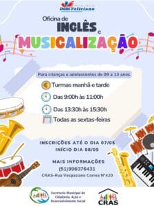 A Prefeitura de Dom Feliciano, por meio da Secretaria Municipal de Cidadania, Ação e Desenvolvimento Social e do CRAS, está com inscrições abertas para a oficina gratuita de Inglês e Musicalização, voltada a crianças e adolescentes de 9 a 13 anos.